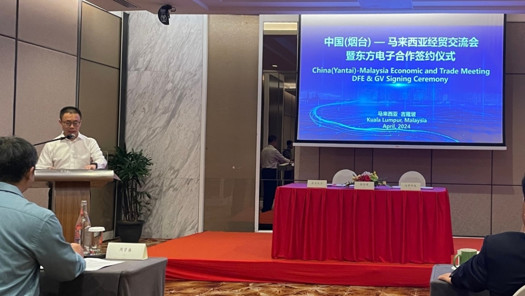 On April 22nd, China (Yantai) - Malaysia Economic and Trade Exchange Conference and Signing Ceremony for Cooperating with Dongfang Electronics, along with China (Yantai) - Malaysia Kuala Lumpur Business Fair, took place in Malaysia. Leading the delegation, Deputy Secretary of the Municipal Party Committee and Mayor Zheng Deyan graced the occasion, witnessing the signing of a strategic cooperation agreement between Dongfang Electronics and Malaysia’s Envision Tech Company in the port electrification sector. The signing ceremony was presided over by You Rulin, Director of the Yantai Municipal Bureau of Commerce. Zhou Xiansheng, President of Envision Tech Company, and Ding Zhenhua, Chairman of Dongfang Electronics Co., Ltd., delivered speeches at the event.