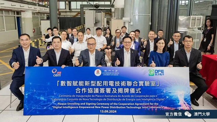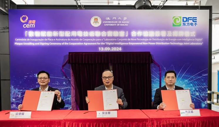 On September 13, Dongfang Electronics Co., Ltd., together with Companhia de Electricidade de Macau (CEM) and the University of Macao, held a plaque unveiling and cooperation agreement signature ceremony for the "Digital Intelligence-Empowered New Power Distribution Technology Joint Laboratory" at the CEM Training Center. The joint laboratory will promote the interchange and practical application of power distribution technologies in Macau's power system, drive the upgrade and transformation of the power industry, assist in building a smart and green city in Macau, and align with the "dual carbon" goals of the country. The cooperation agreement for the joint laboratory was signed by Song Yonghua, Rector of University of Macao; Bernie Leong, Chairman of CEM Executive Committee and Fang Zhengji, Chairman of Dongfang Electronics.