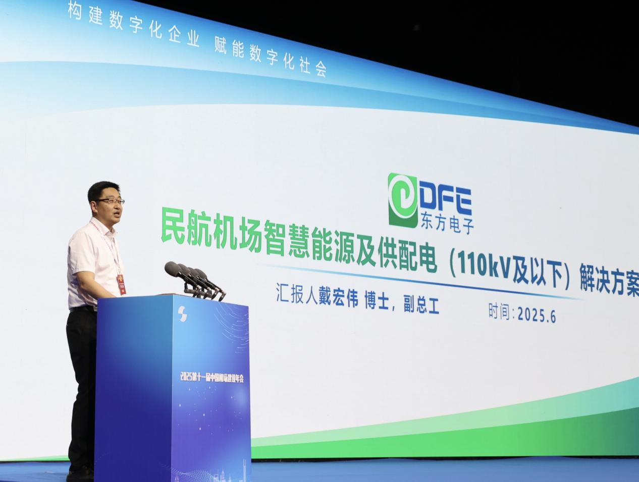 From June 11 to 13, the 11th China Airport Construction Annual Conference 2025 was held at the Dalian World Expo Center. Centered on the theme of "Low-Carbon Aviation and Smart Construction," the event also featured the 11th China Airport Engineering Achievement Exhibition, alongside the "China Airport Construction, Design, and Facilities Expo." Dongfang Electronics Corporation (DFE) was invited to participate and delivered a keynote speech titled "Smart Energy and Power Supply & Distribution (Up to 110kV) Solutions for Civil Aviation Airports."