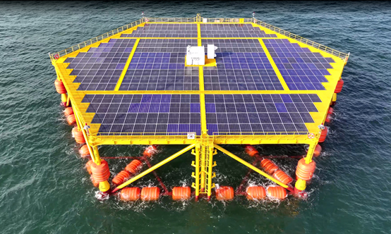 “黄海一号”平台框架采用桁架式钢塑混合浮体构型,有效气隙高、生存性能强,抗浪能力超过10米高,是我国目前建成水深最深的漂浮式海上光伏平台。平台通过风光同场开发的模式,稳定地吸收风能和太阳能,有效降低成本,提升海洋利用率,优化能源结构。