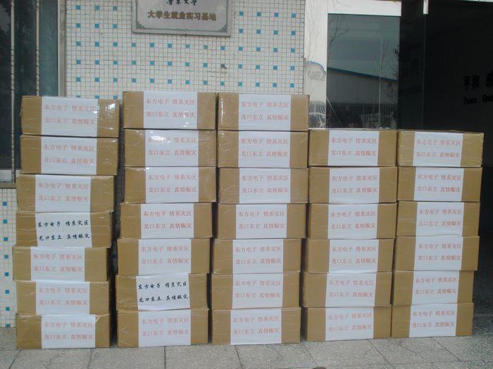 21日下午4点,免费运输赈灾物资的车辆到达,公司领导和工人们一起动手装车。满载着东方电子全体员工期盼和祝福的照明设备运往雅安灾区……