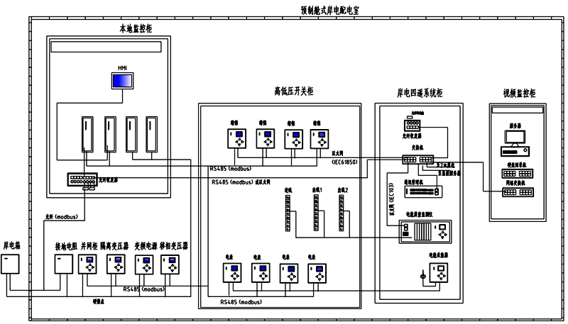 岸电系统主要是将码头配电室提供的6kV/50HZ电源,经过高低压岸电变频电源等配电装置变频变压后,转换成6kV/50HZ、6.6kV/60HZ或400V/50HZ、450V/60HZ的船用电源,给船舶供电;该项目成套岸电系统主要包括高低压开关柜、变频电源、输入输出变压器、预制舱、岸电箱等设备以及监控系统、岸电四遥系统、视频监控系统、电能质量检测系统、电能采集系统。