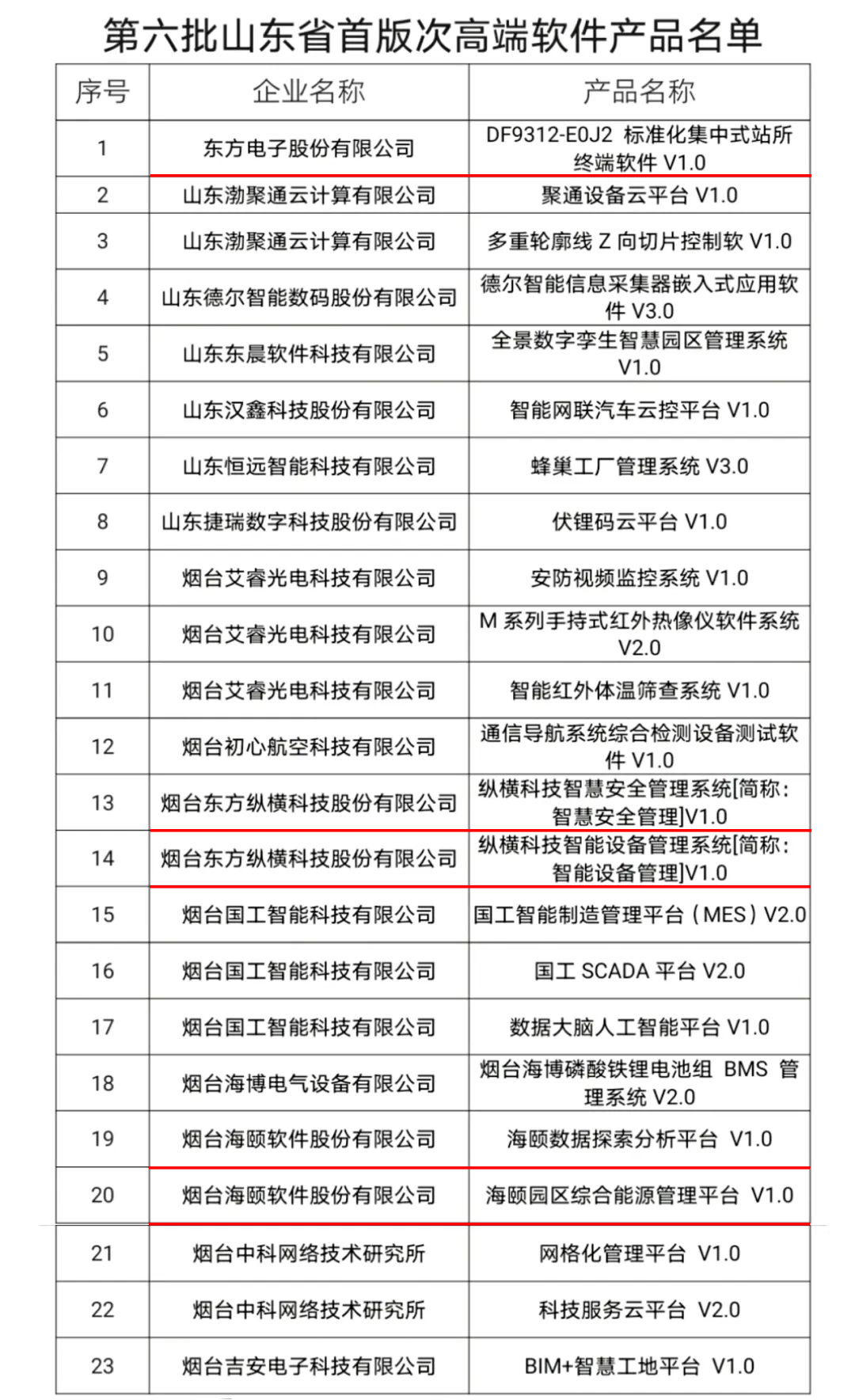 近日,省工业和信息化厅公布了第六批山东省首版次高端软件产品名单。烟台市23个软件产品位列其中,数量居全省第3位。东方电子股份有限公司(以下简称“东方电子”)“DF9312-E0J2标准化集中式站所终端软件V1.0”、东方电子旗下烟台东方纵横科技股份有限公司“智慧安全管理V1.0"、"智能设备管理V1.0"、东方电子旗下烟台海颐软件股份有限公司“海颐数据探索分析平台V1.0”、“海颐园区综合能源管理平台V1.0”入选。