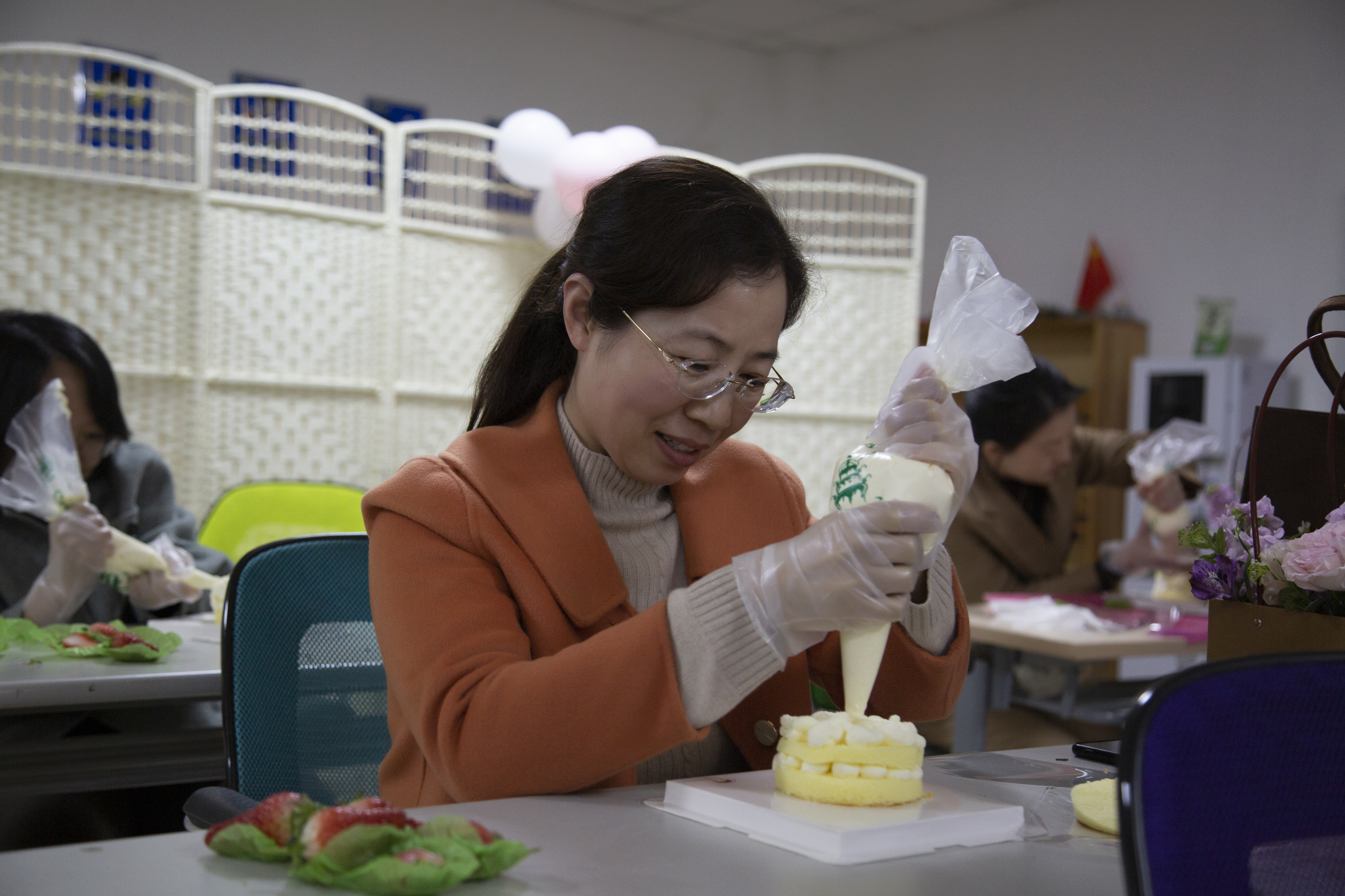 活动邀请了专业蛋糕制作老师进行指导,详细地为大家讲解制作工具的使用、食材的搭配比例,并进行操作演示。女神们在专业老师的耐心指导下,变身蛋糕制作大师,开始动手忙起来——涂抹奶油、做花边、点缀水果,一个个色彩斑斓、创意满满的蛋糕映入眼帘,空气中充满了甜蜜的味道,让人垂涎欲滴。