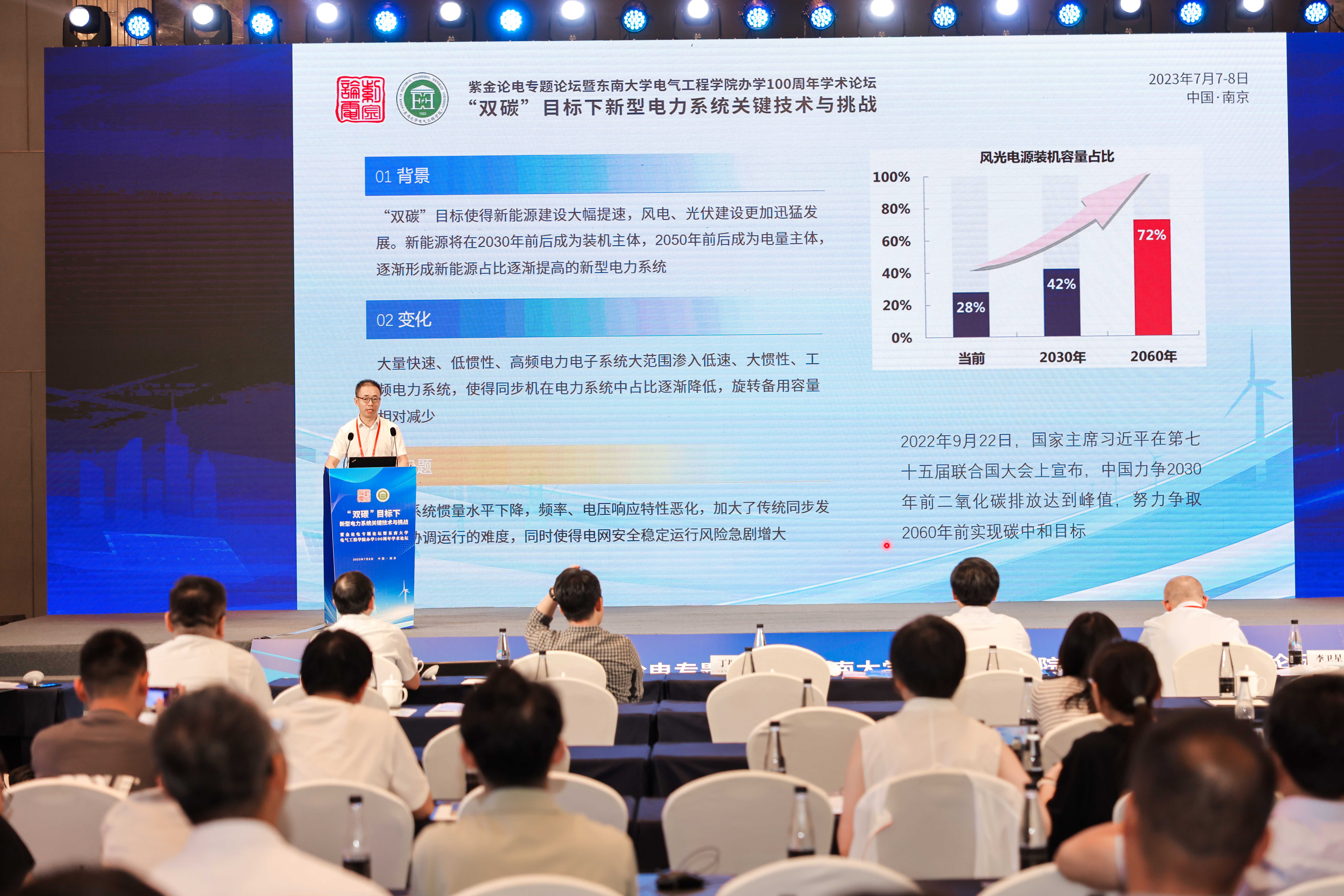 2023年7月8日,由中国电机工程学会电力系统自动化专业委员会指导,国网电力科学研究院有限公司期刊中心和东南大学电气工程学院联合主办的“紫金论电专题论坛暨东南大学电气工程学院办学100周年学术论坛——‘双碳’目标下新型电力系统关键技术与挑战”在江苏南京召开。东方电子股份有限公司董事长丁振华受邀参加紫金论电专题论坛并作报告。