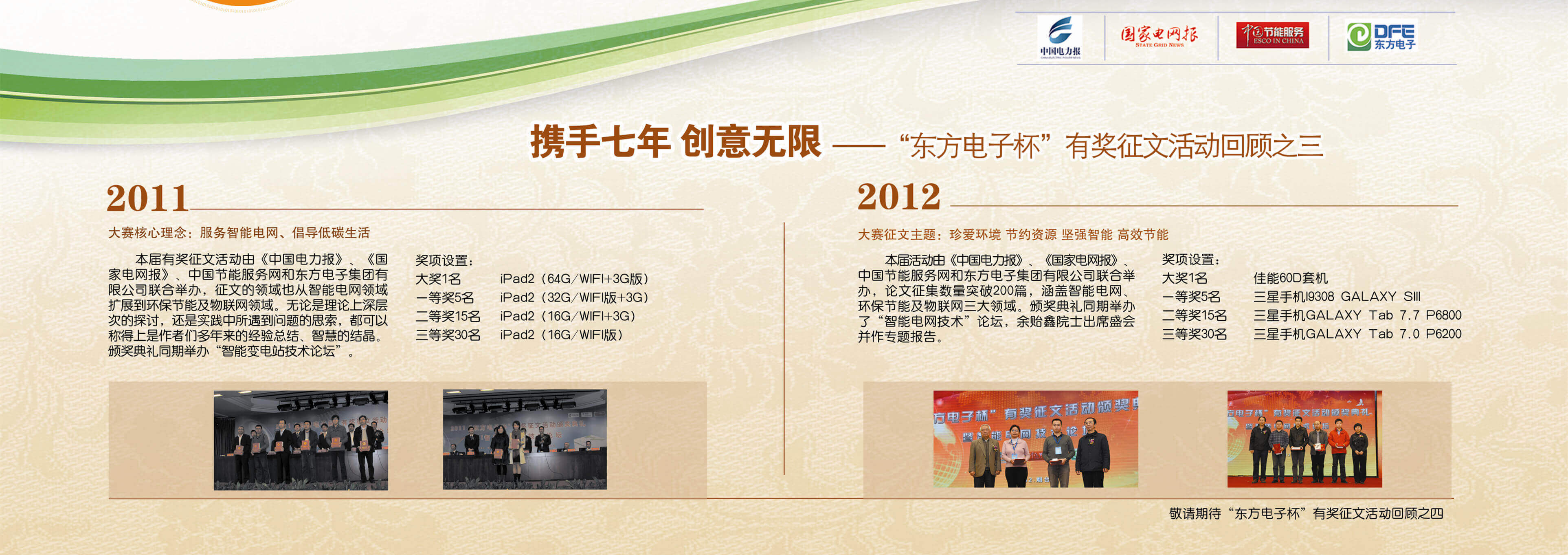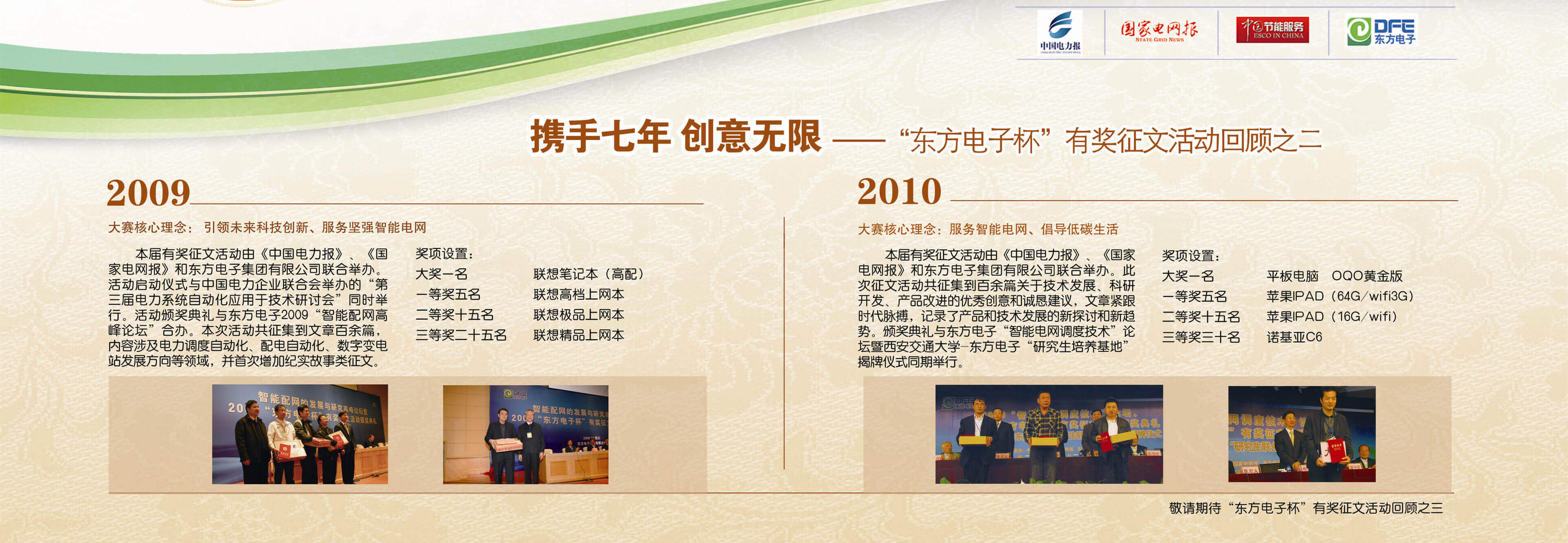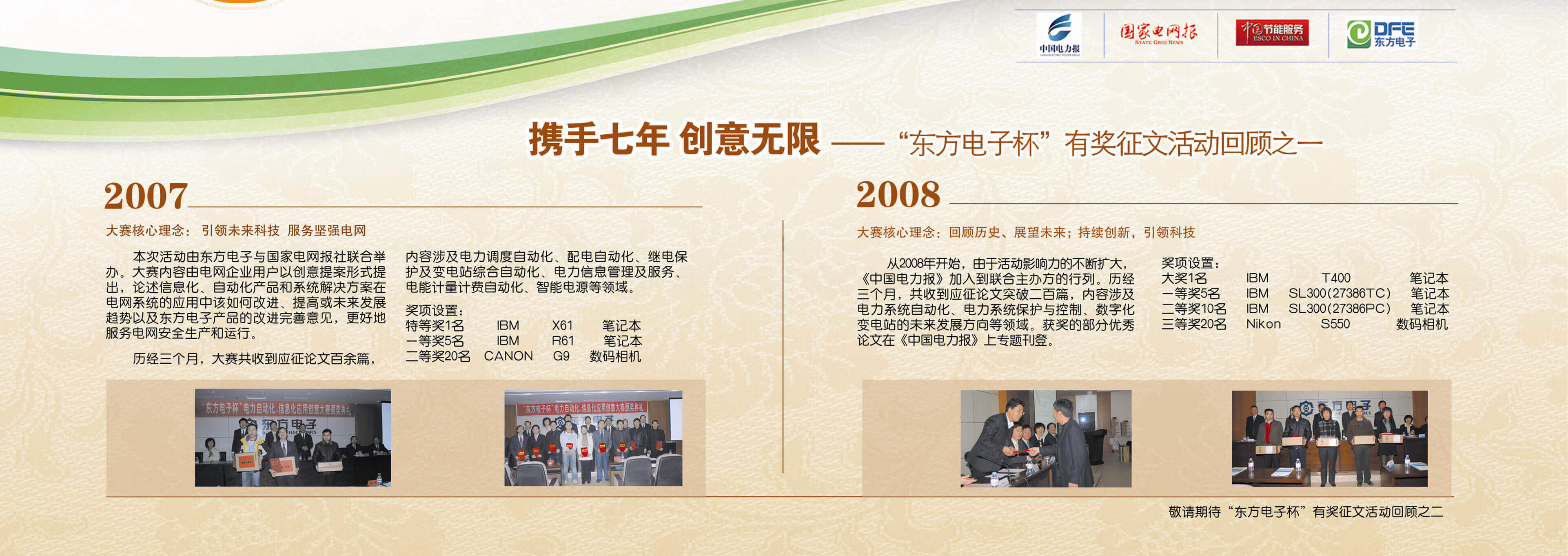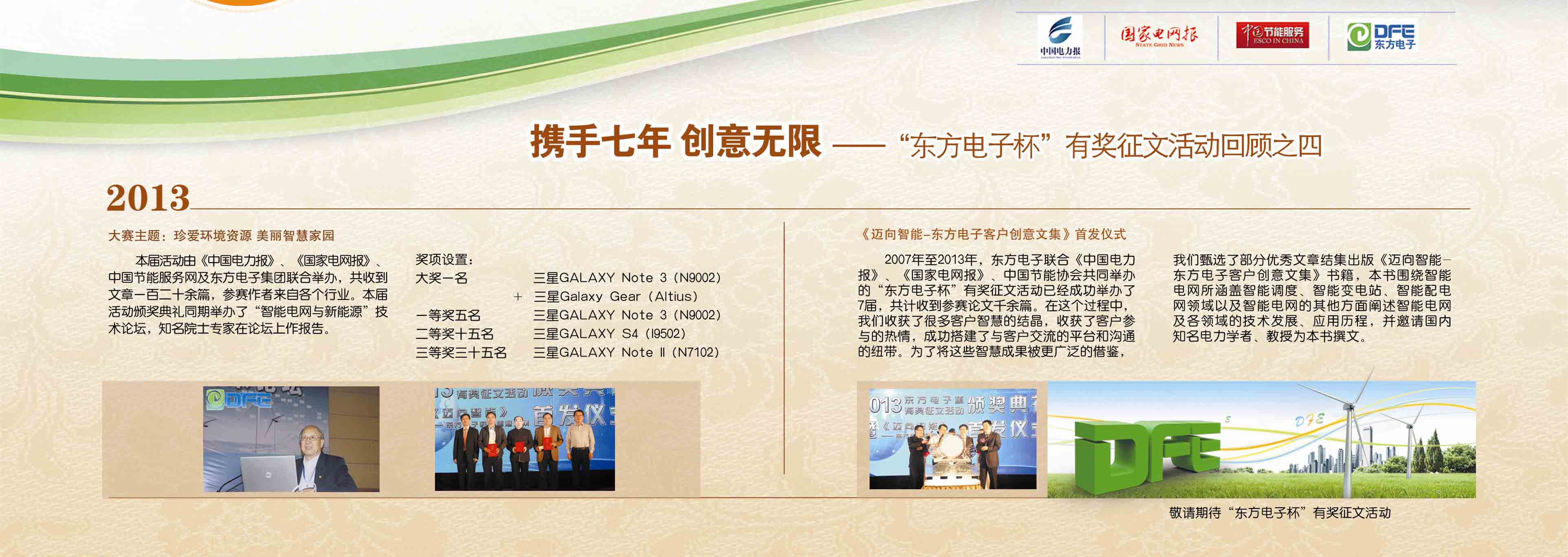 2007年至今,由东方电子联合《中国电力报》、《国家电网报》、《中国节能服务》杂志共同举办的“东方电子杯”有奖征文活动已成功举办七届,在这个过程中,我们收获了很多客户智慧的结晶、收获了客户参与的热情,成功搭建了与客户交流的平台和沟通的纽带。